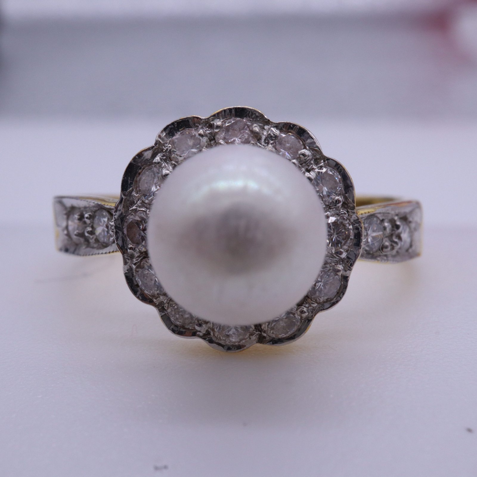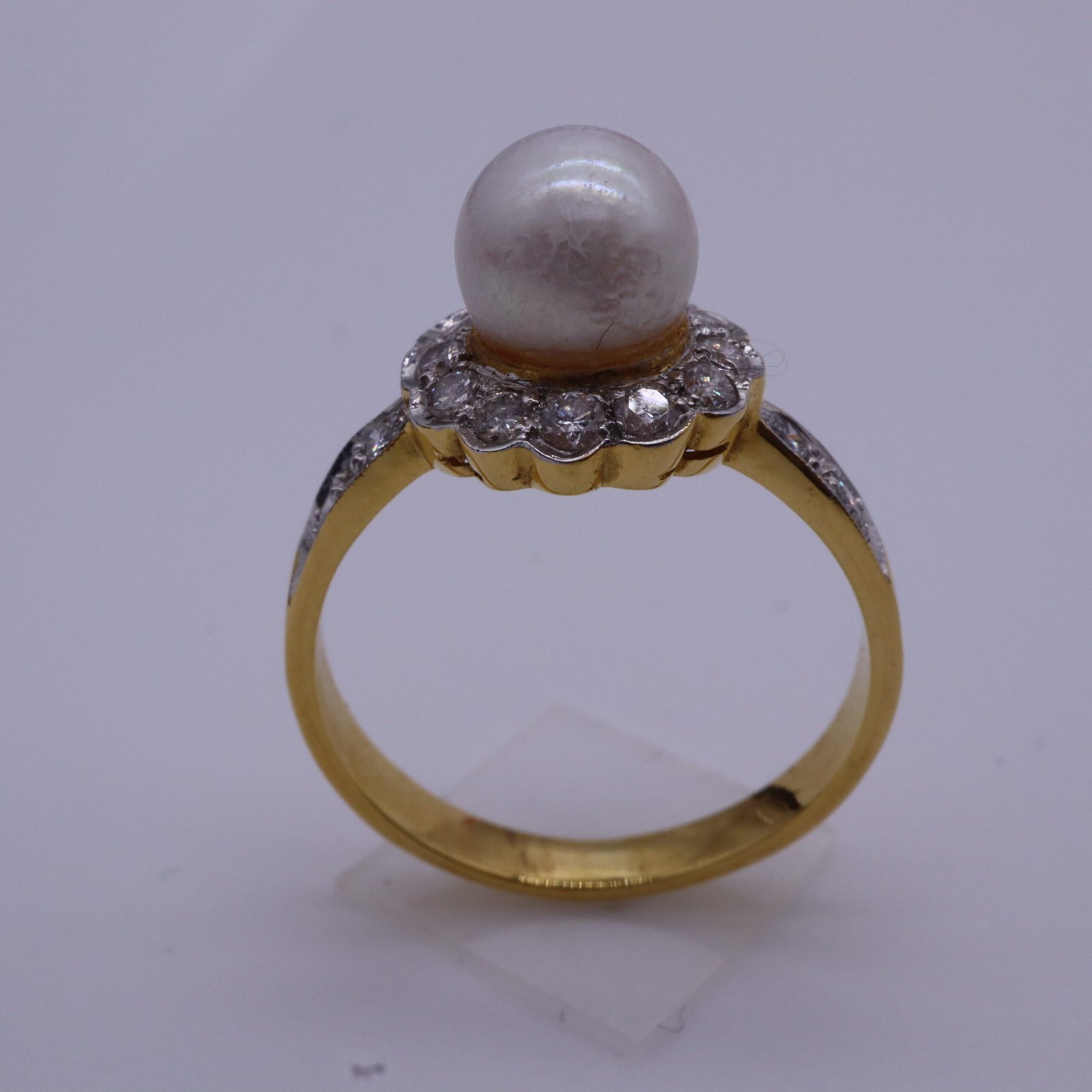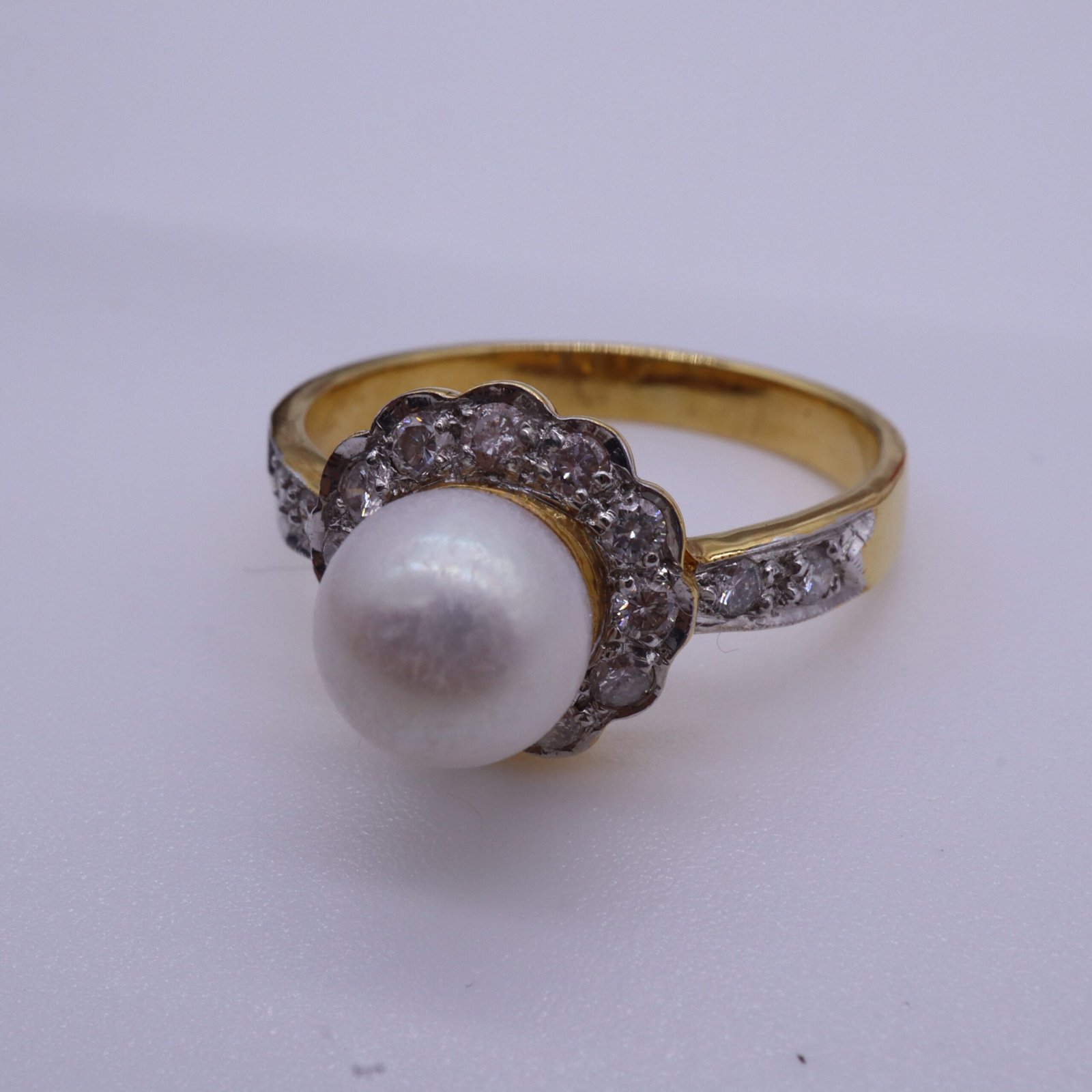 Crafted in elegant 18K Yellow Gold, this ring features a pure white Natural South Sea Pearl, and 16 diamonds in a round shape, with a total weight of approximately 0.26 carats. Graded VVS1, the diamonds are sourced from Belgium and come with GIA/ IGI/ GIT certification. Weighing 3.10 grams and designed in size 5.50 (US), this timeless piece combines refined craftsmanship with sophisticated charm, making it a perfect choice for any occasion.