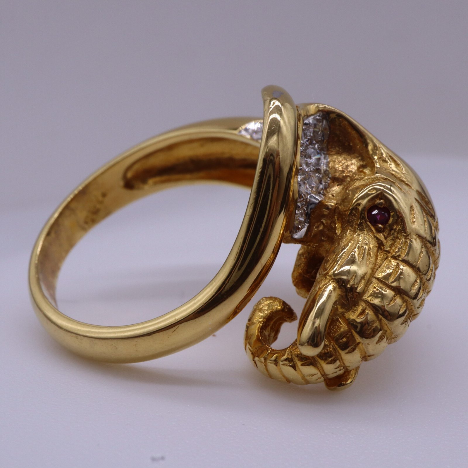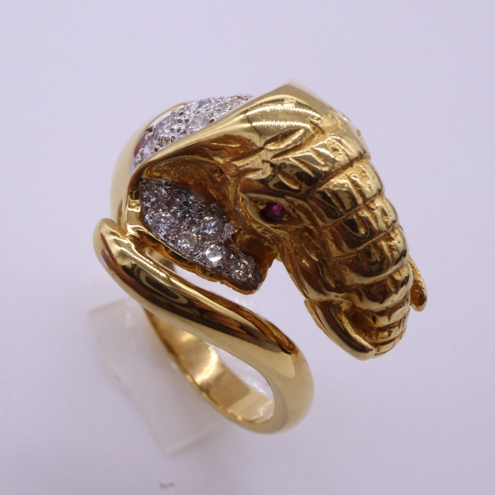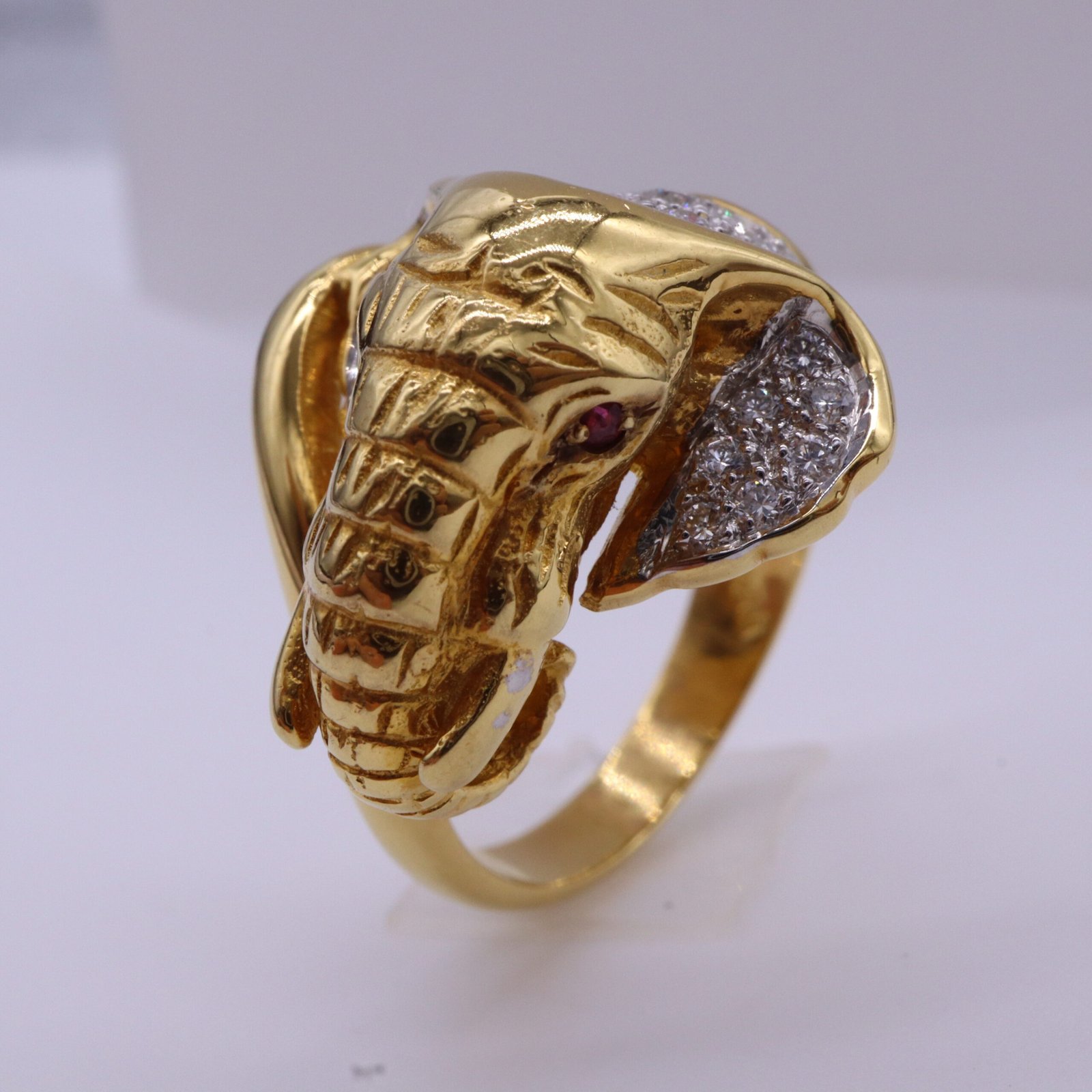 Crafted in exquisite 18K Yellow Gold, this ring is inspired by the Thai-venerated Elephant deity “Erawan” and features a magnificent pair Natural Burmese Rubies as its eyes, showing fierceness and mystical beauty.