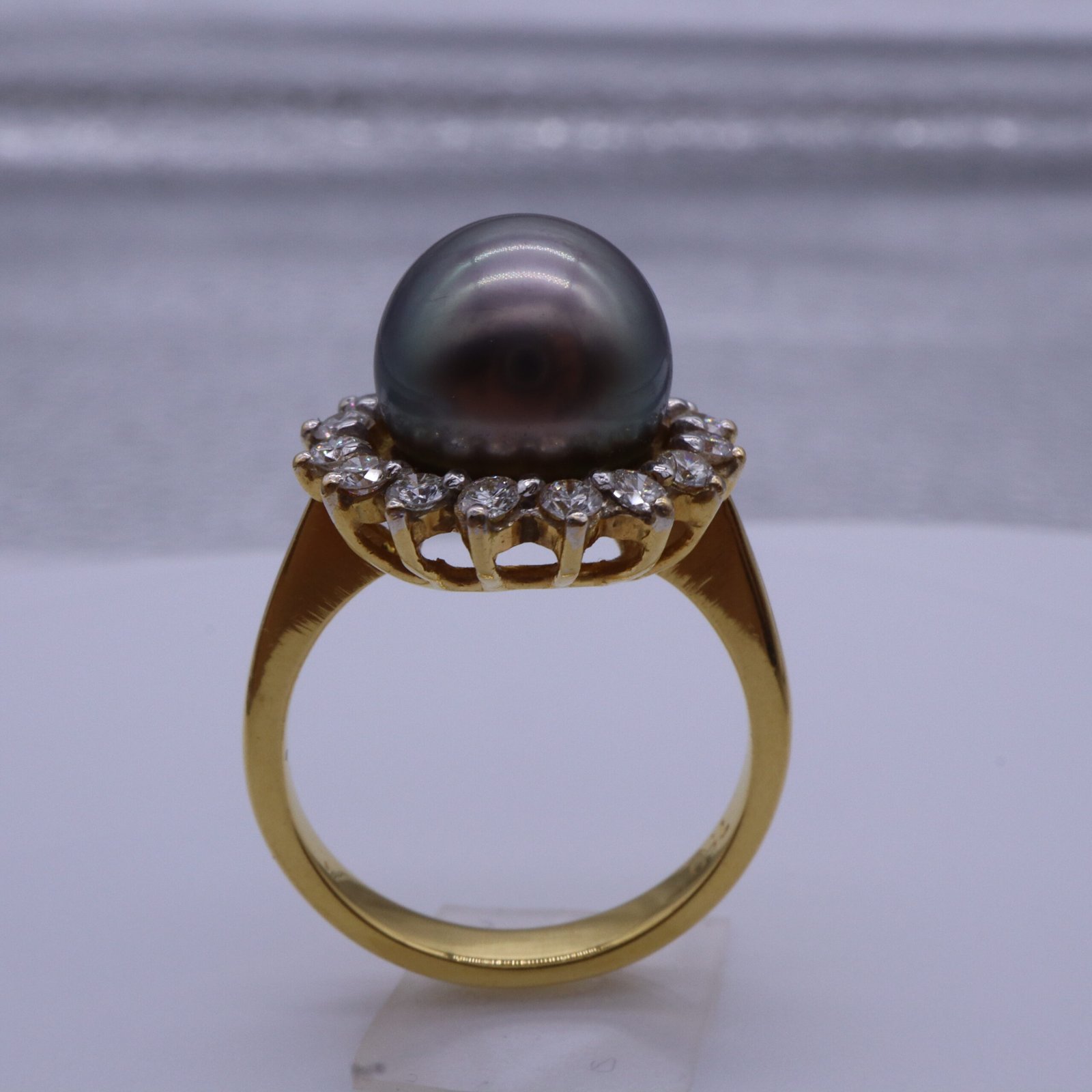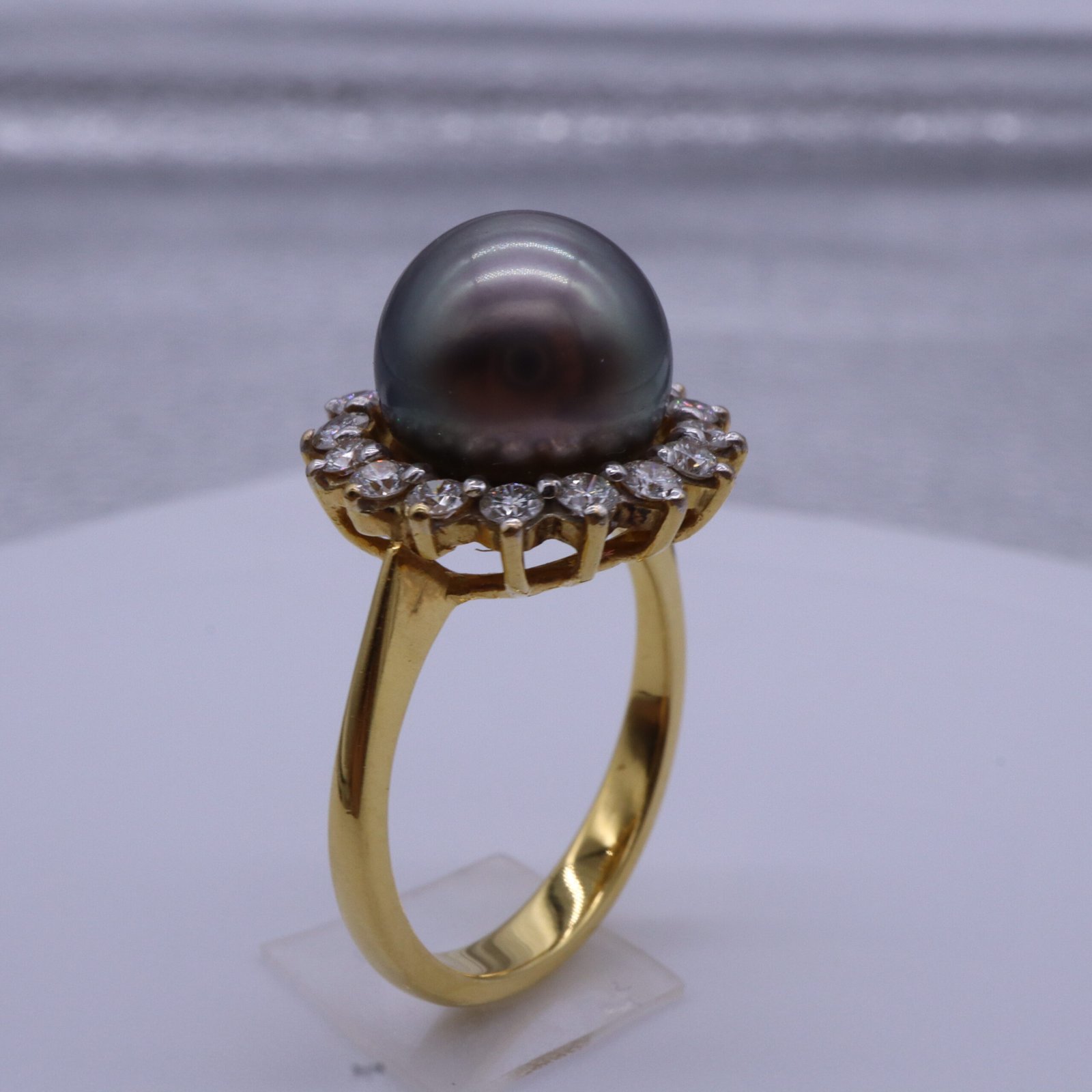 Crafted in exquisite 18K Yellow Gold, this ring showcases a magnificent AAA-graded Tahitian black pearl, celebrated for its deep, lustrous sheen and unparalleled quality.