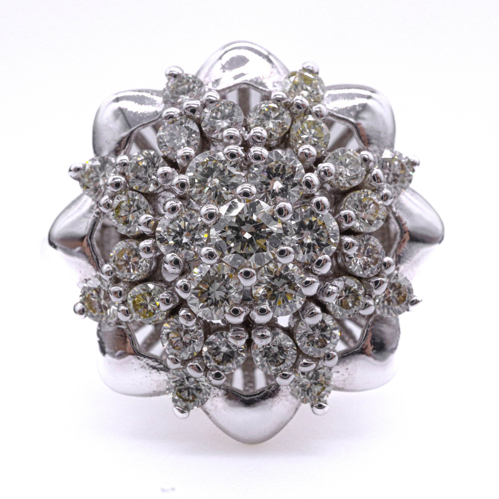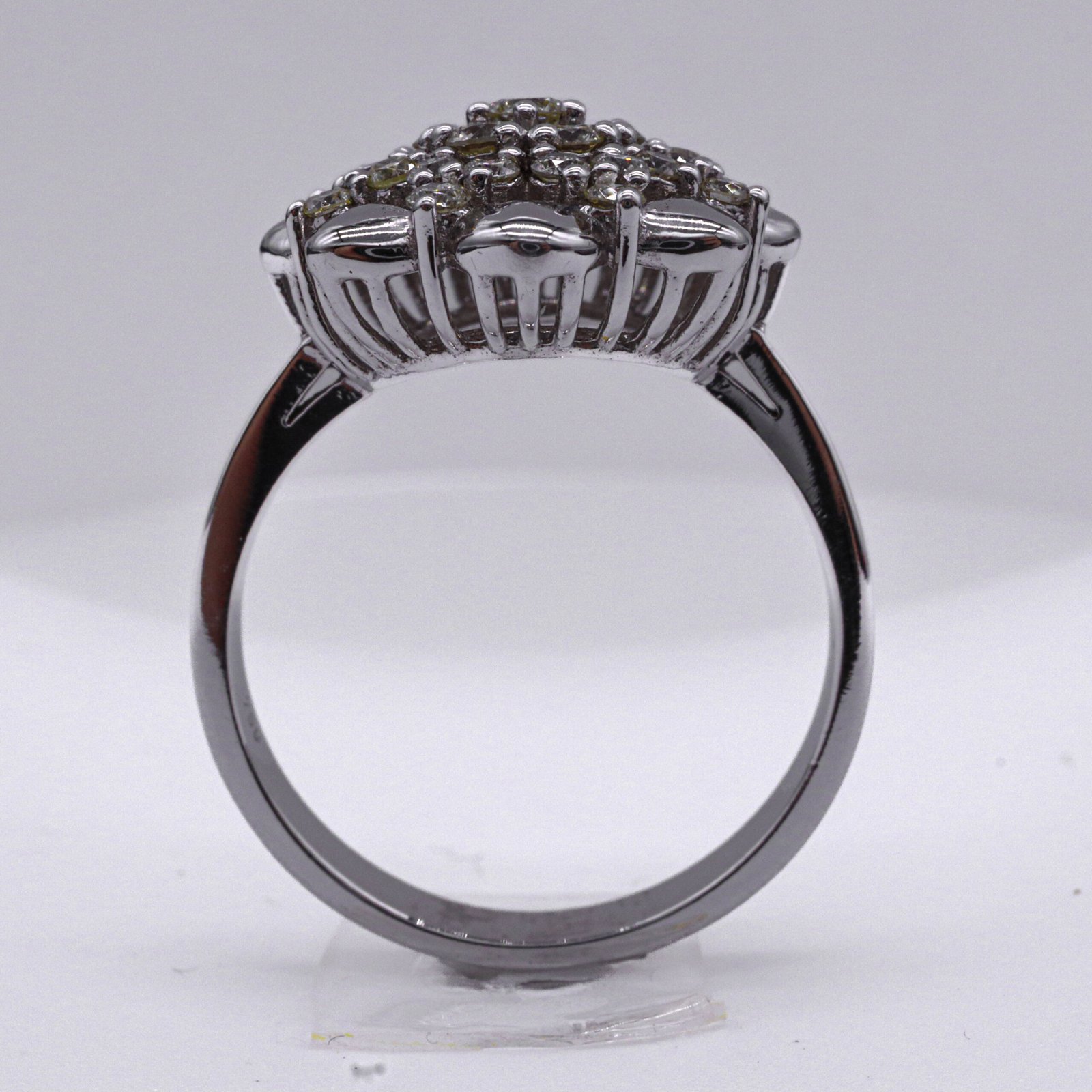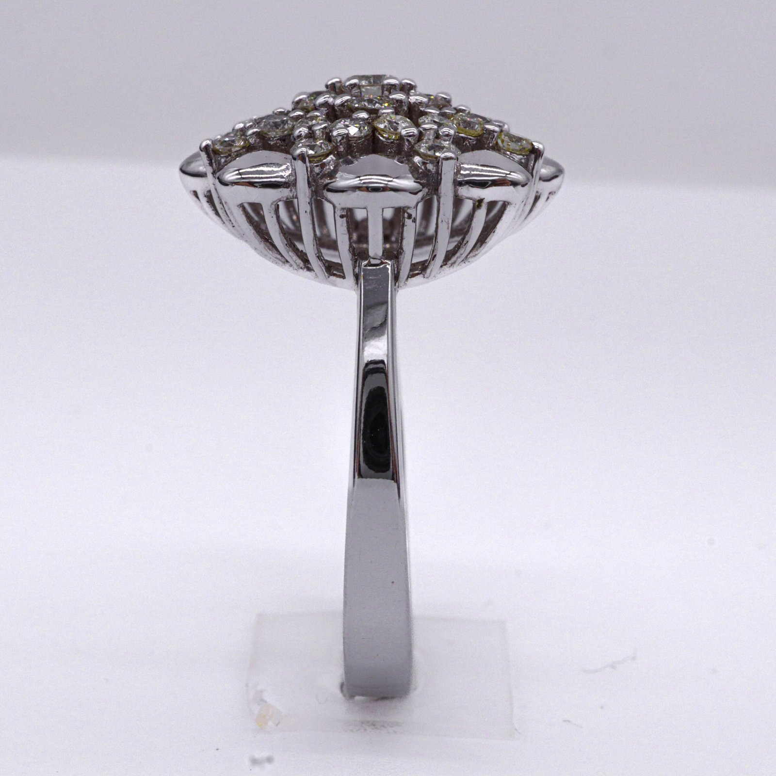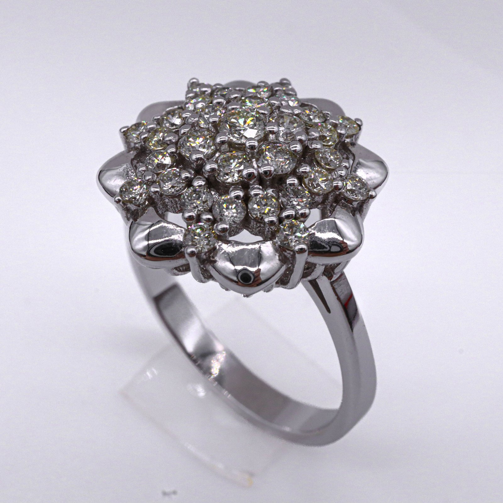Crafted in pure 18K White Gold, this exceptionally beautiful ring inspired by a wild flower, features 31 diamonds: 7 bigs, and 24 smaller ones, in a round shape, with a total weight of 0.45 carats. Graded VVS1, the diamonds are sourced from Belgium and come with GIA/ IGI/ GIT certification.